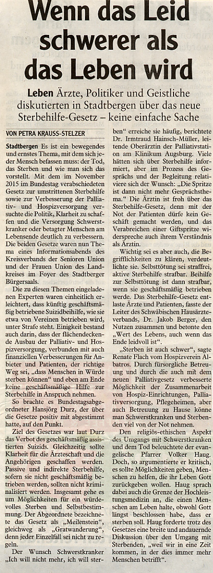 | 19.04.2016 | 18.30 Uhr | Podiumsdiskussion "Palliativ. Hospiz. Sterbehilfe | Bürgersaal Stadtbergen |