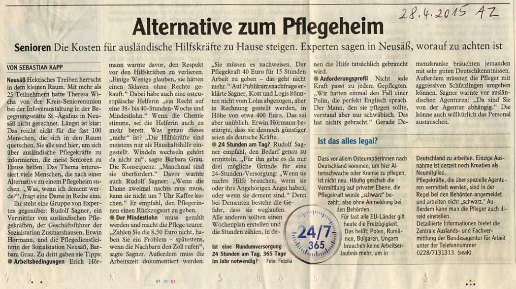 | 23.04.2015 | 14.30 Uhr | Veranstaltung "Pflege zu Hause durch ausländische Vollzeitkräfte" | Neusäß, Pfarrsaal St. Ägidius |